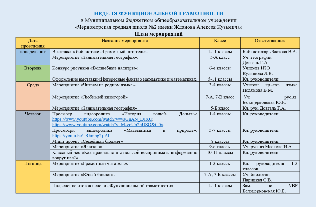 С целью формирования функциональной грамотности, активизации познавательной деятельности обучающихся, развития интеллектуальных и творческих способностей, интеграции учебной, развивающей и воспитательной деятельности учащихся в МБОУ «Черноморская средняя школа №2 им. Жданова А.К.» прошла НЕДЕЛЯ ФУНКЦИОНАЛЬНОЙ ГРАМОТНОСТИ с 18.11.24-22.11.24 г.